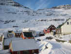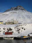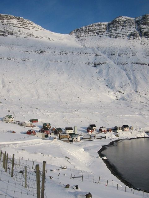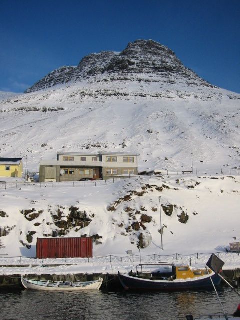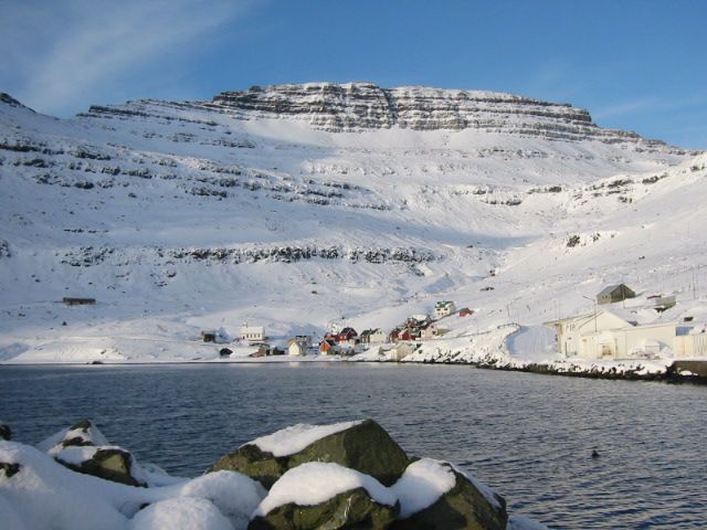 Árnafjørður ligger i bunden af en dyb fjord af samme navn på Borðoys østside.