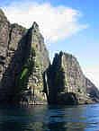 På øens vestside er der imponerende fuglefjelde og forbjerge der falder lodret ned i havet.